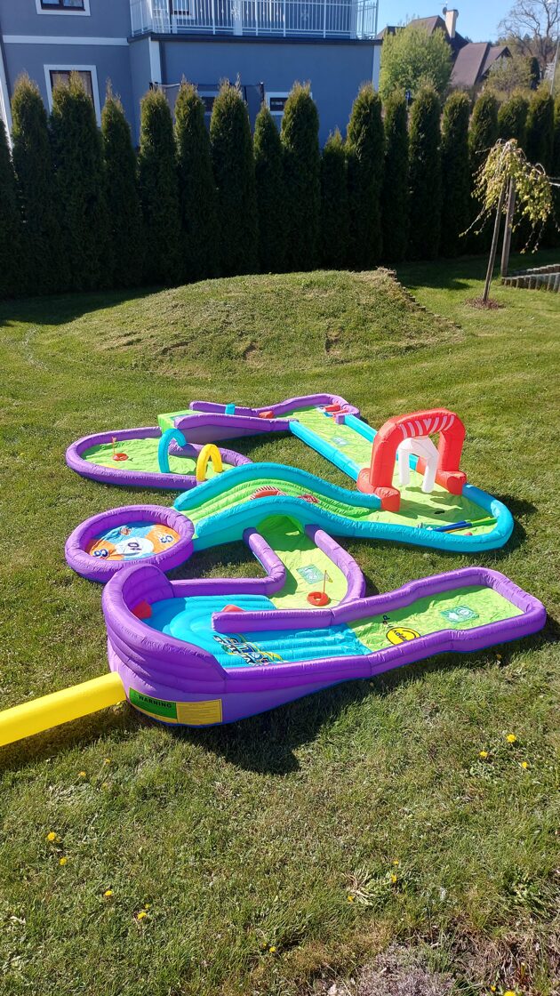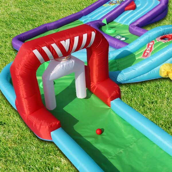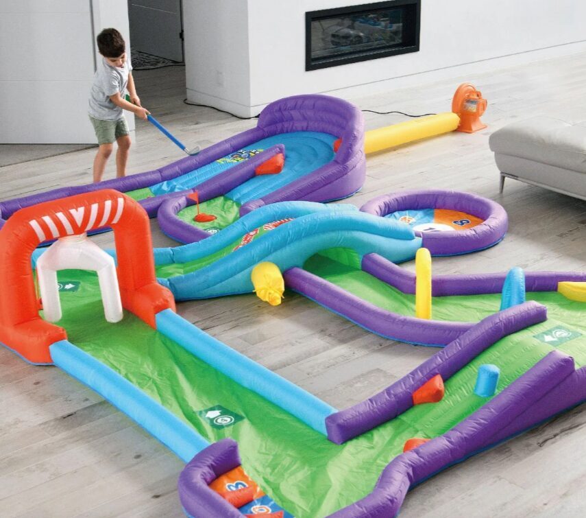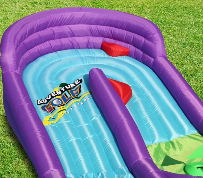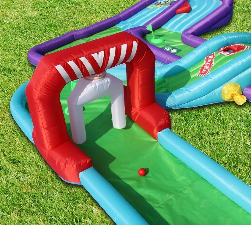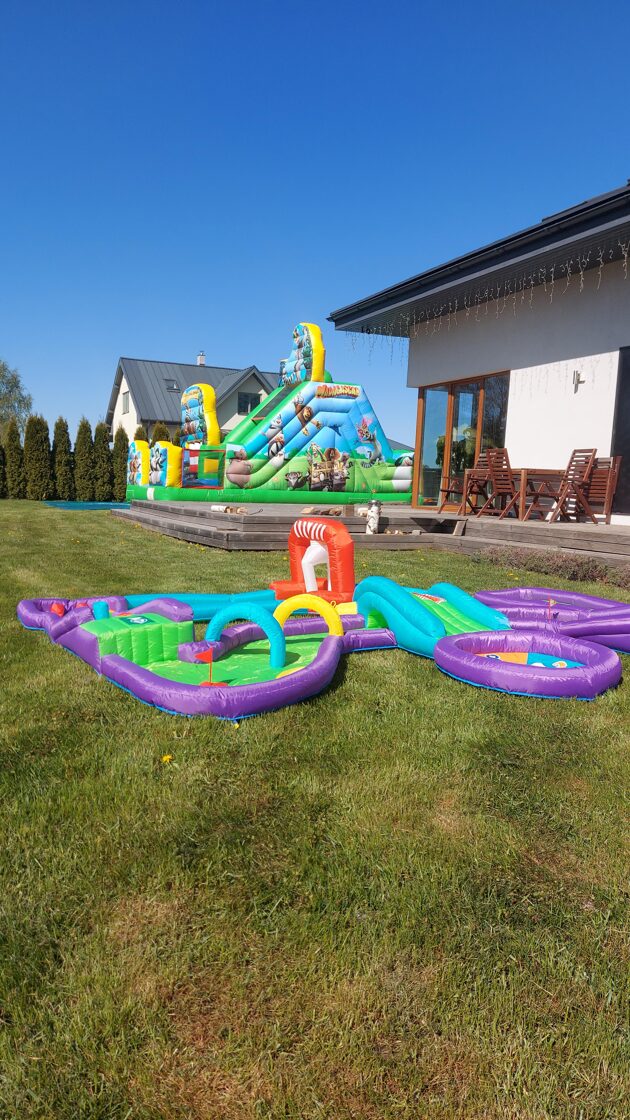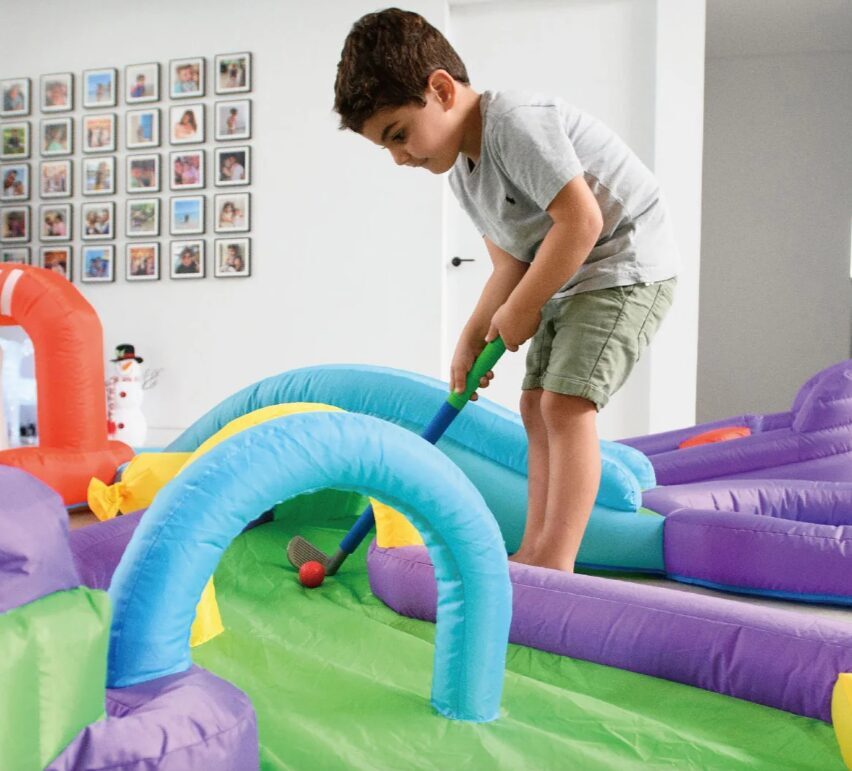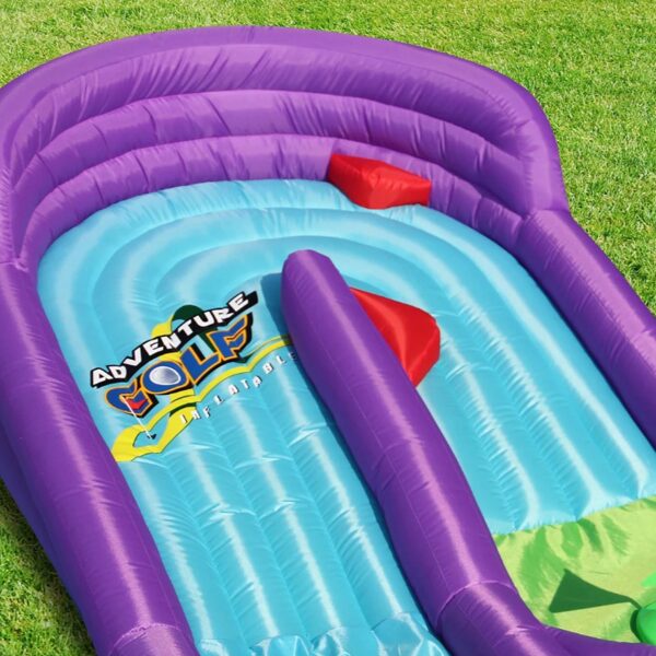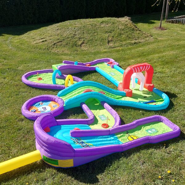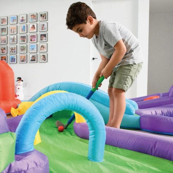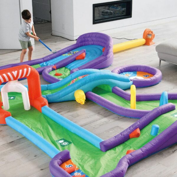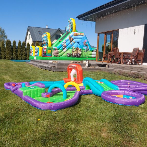 Piepūšamais mini golfs, aktivitāte bērniem, lietošanai iekštelpās vai ārā. Nepieciešama elektrība. Atrakcijas izmērs: 3,7 x 3m un 65cm augsts.NOMAS CENA: